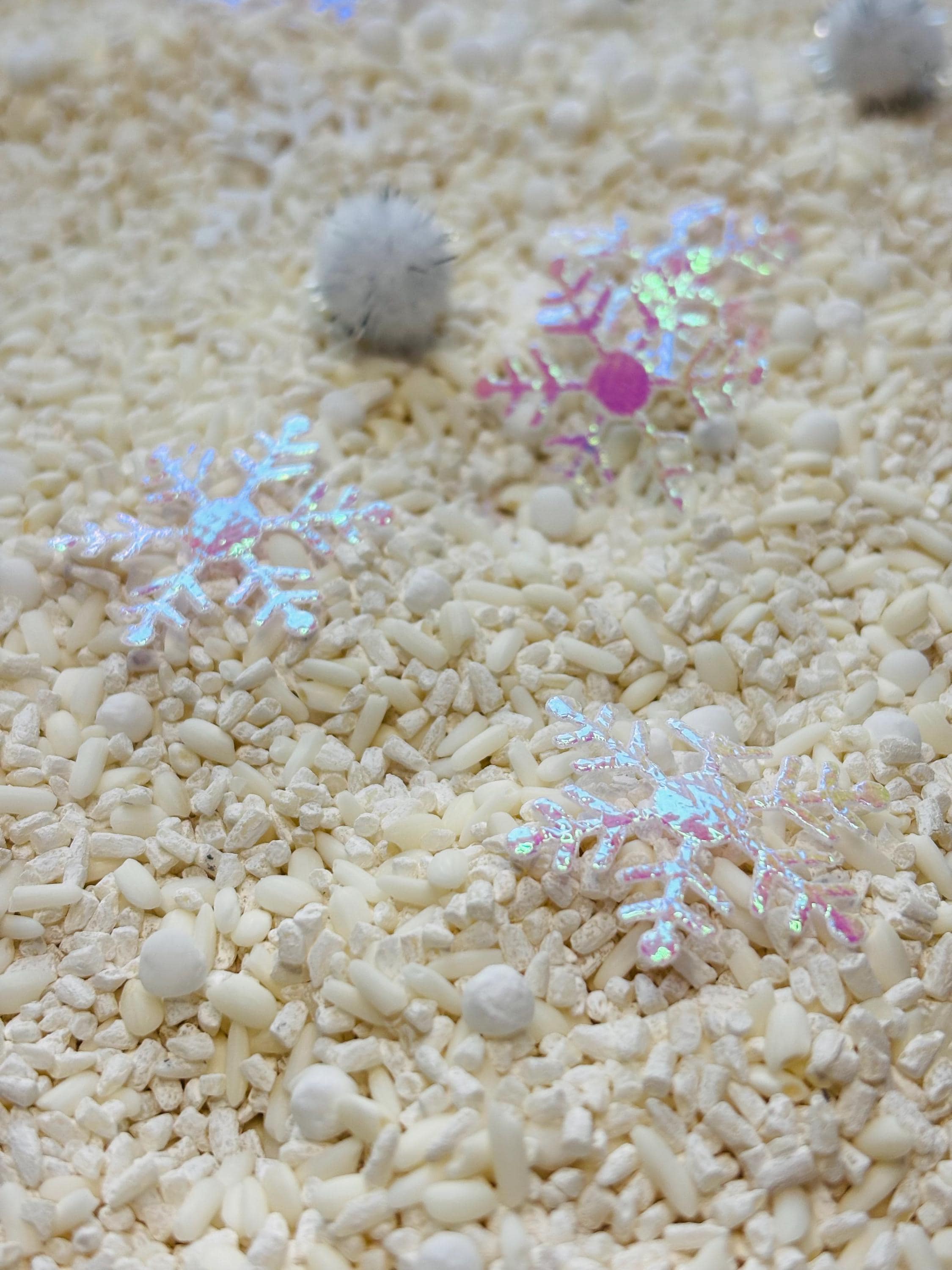 * 3 cups of sensory mix made of kid safe colored rice, Tapioca, sparkly mini white pompoms and plastic snowflake confetti.