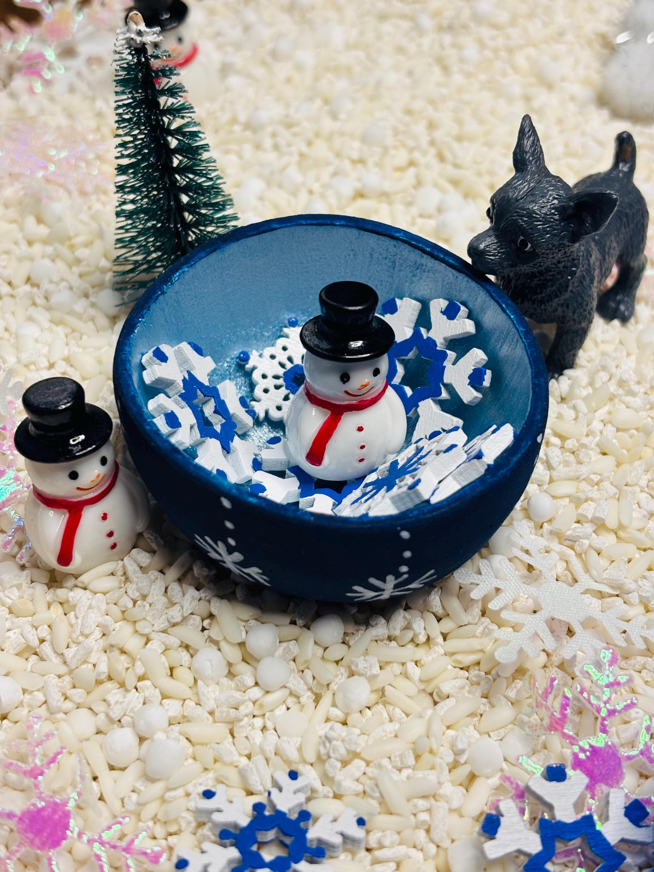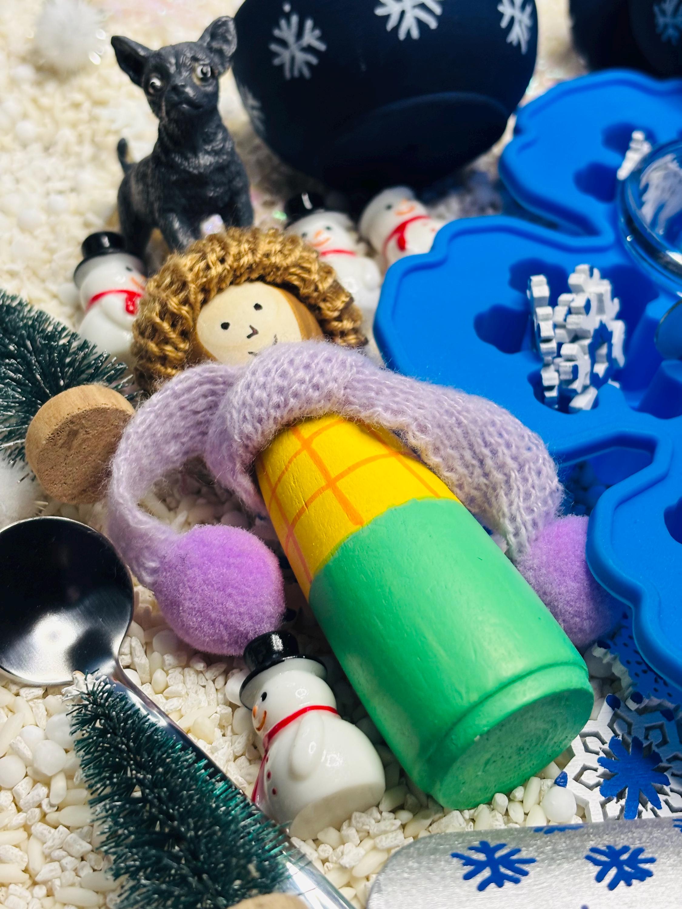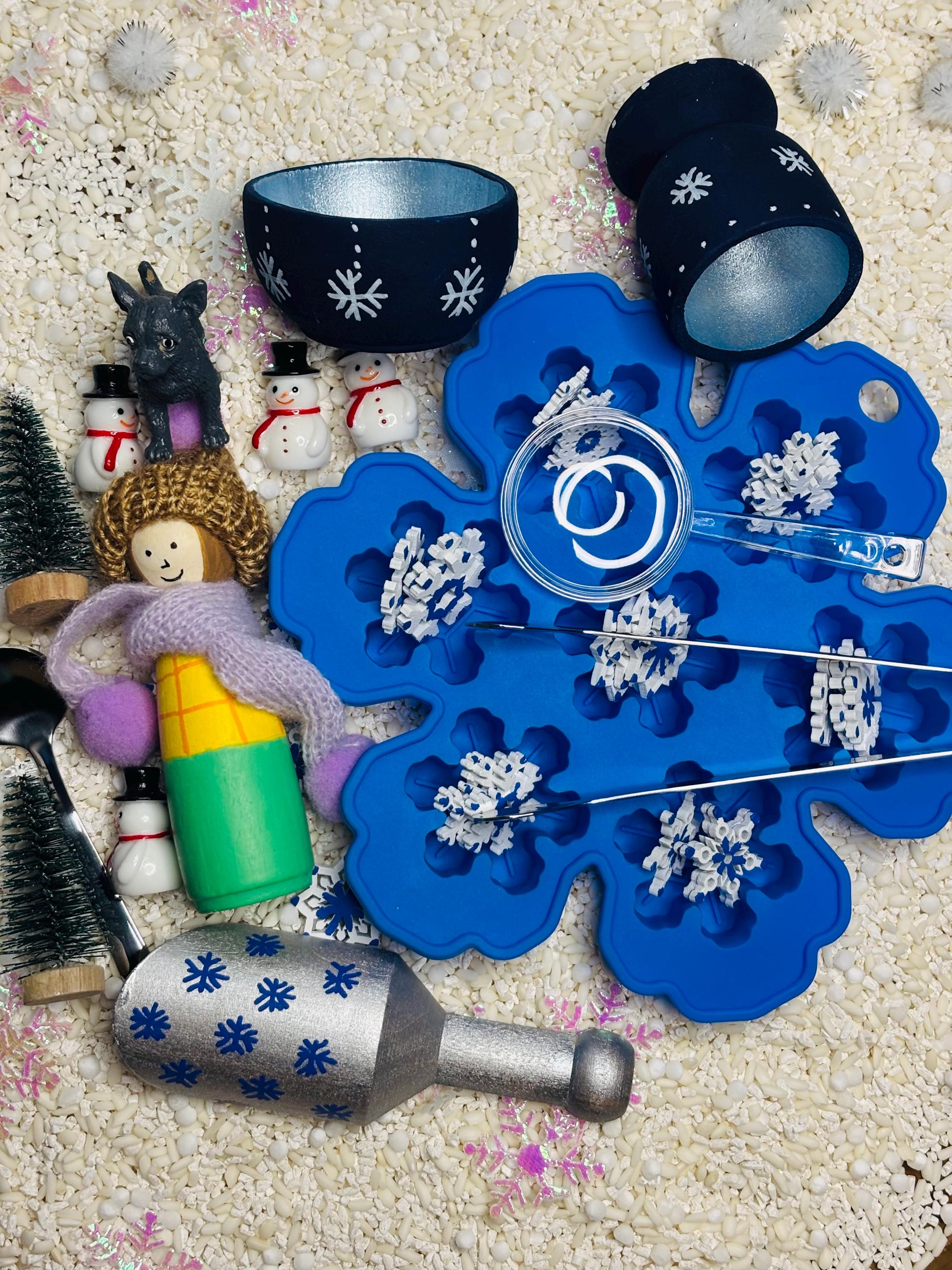 * Loose parts - 5 plastic mini snowmen, 3 plastic trees, hand painted wooden girl peg doll with scarf and hat, mini plastic dog, silicone snowflake ice tray, 28 hand painted wooden mini snowflakes.