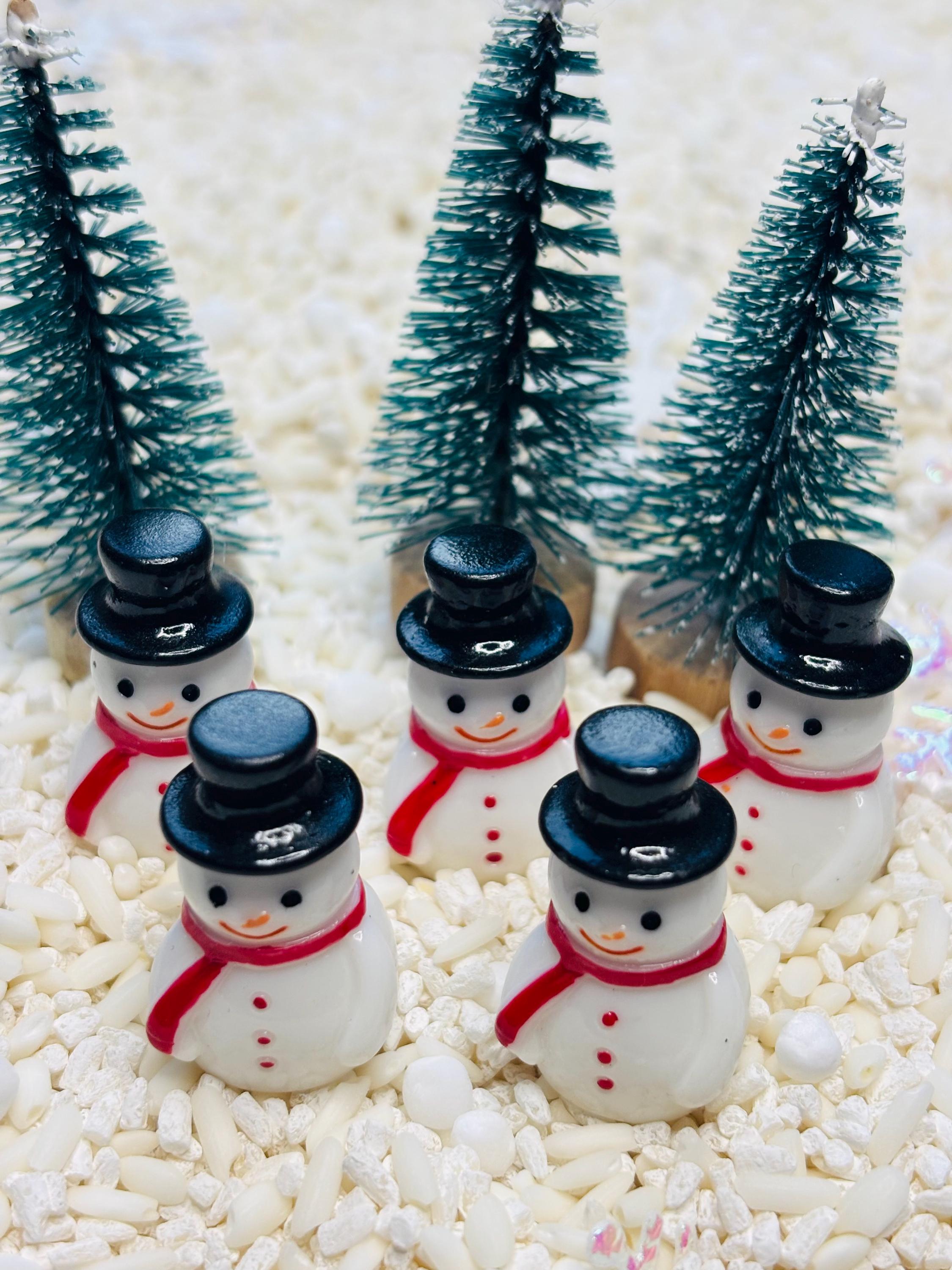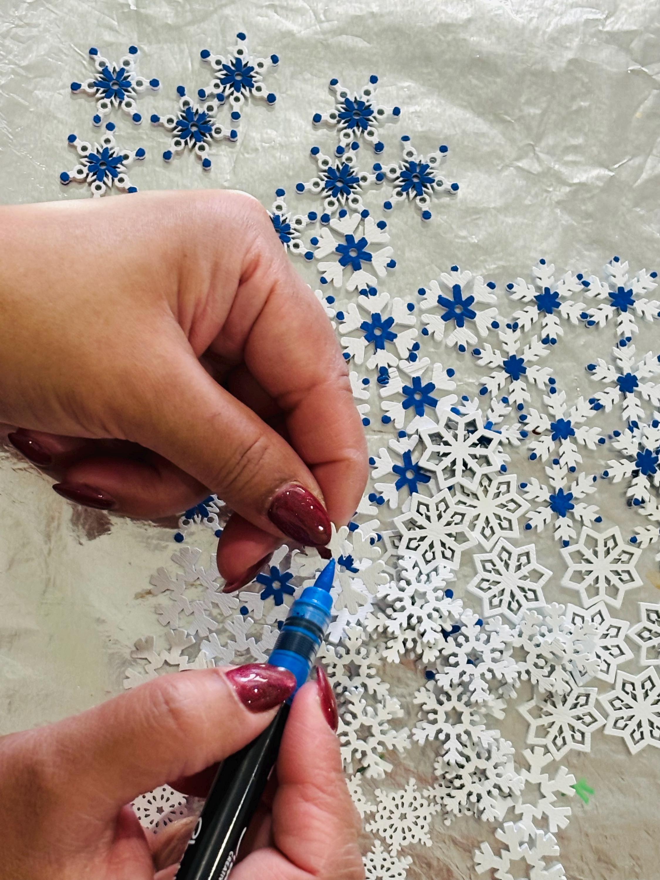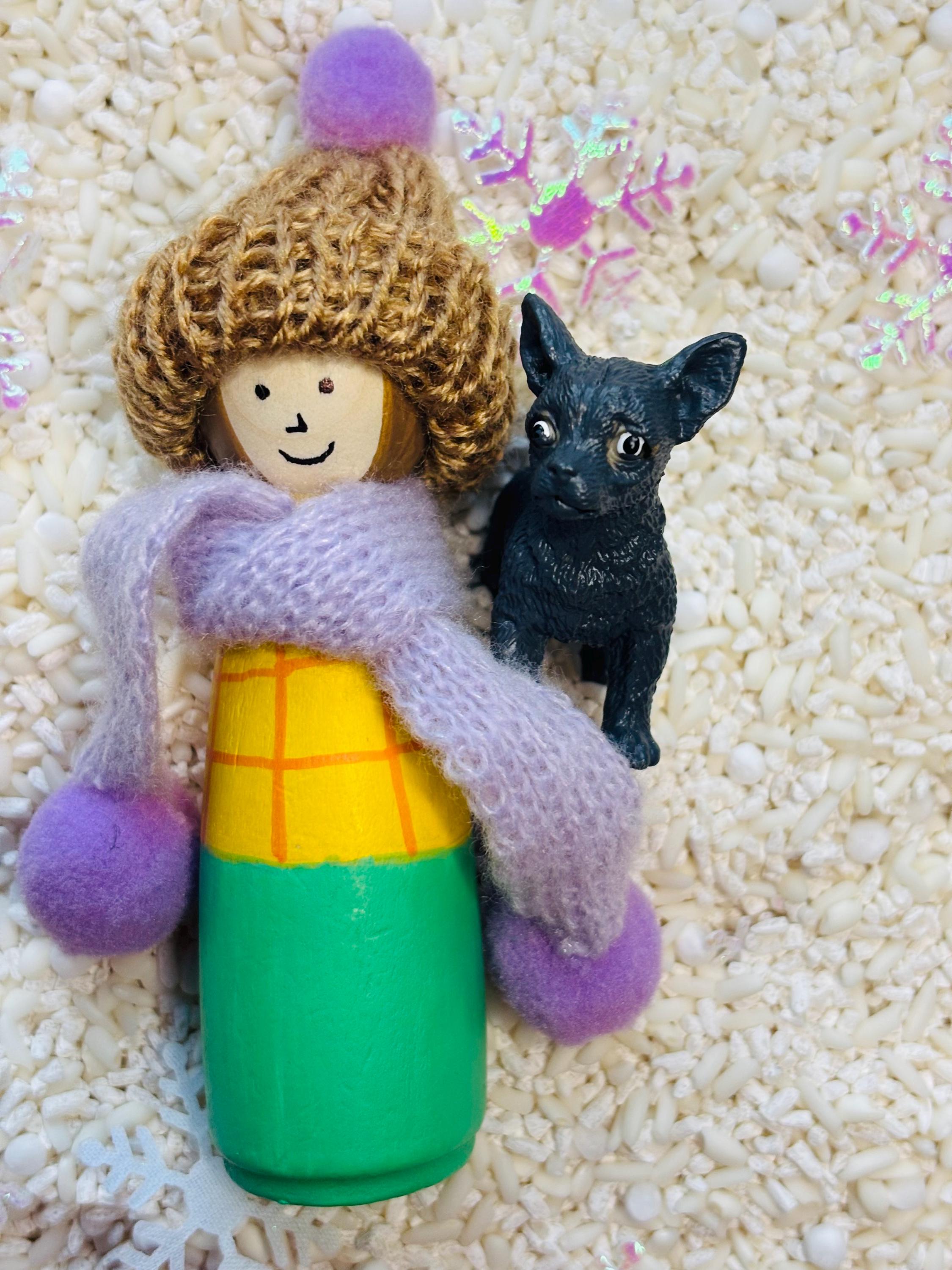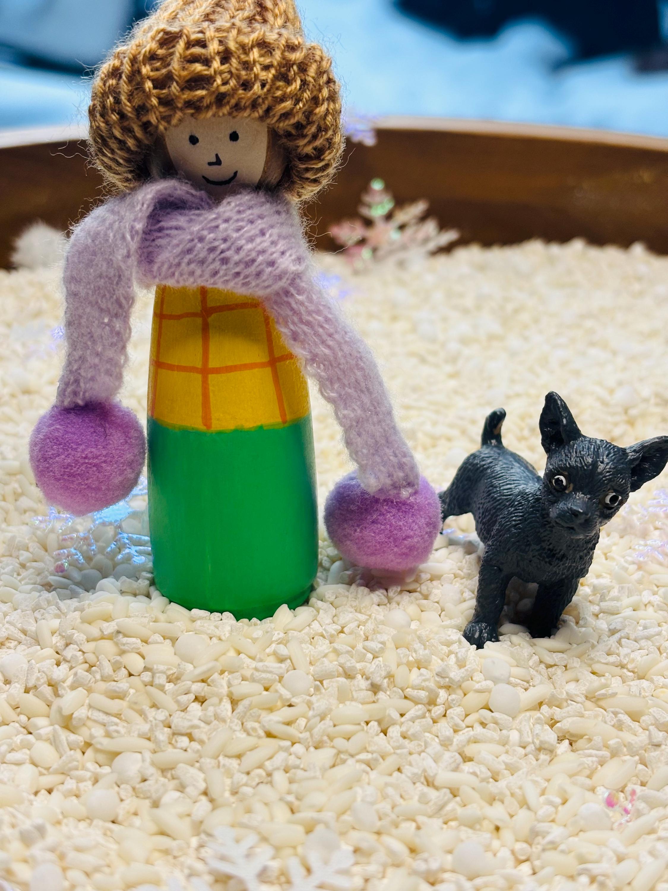 * Loose parts - 5 plastic mini snowmen, 3 plastic trees, hand painted wooden girl peg doll with scarf and hat, mini plastic dog, silicone snowflake ice tray, 28 hand painted wooden mini snowflakes.