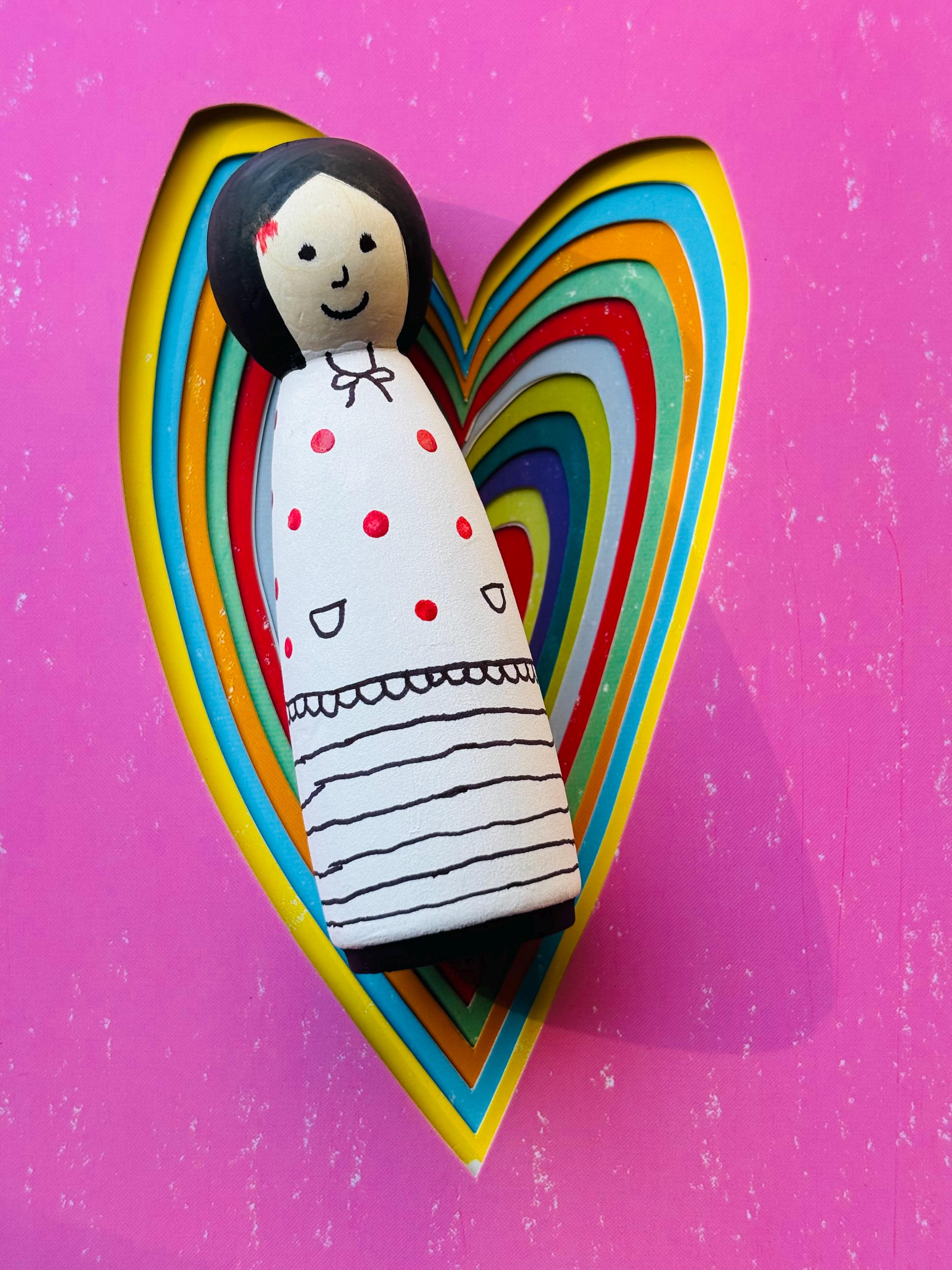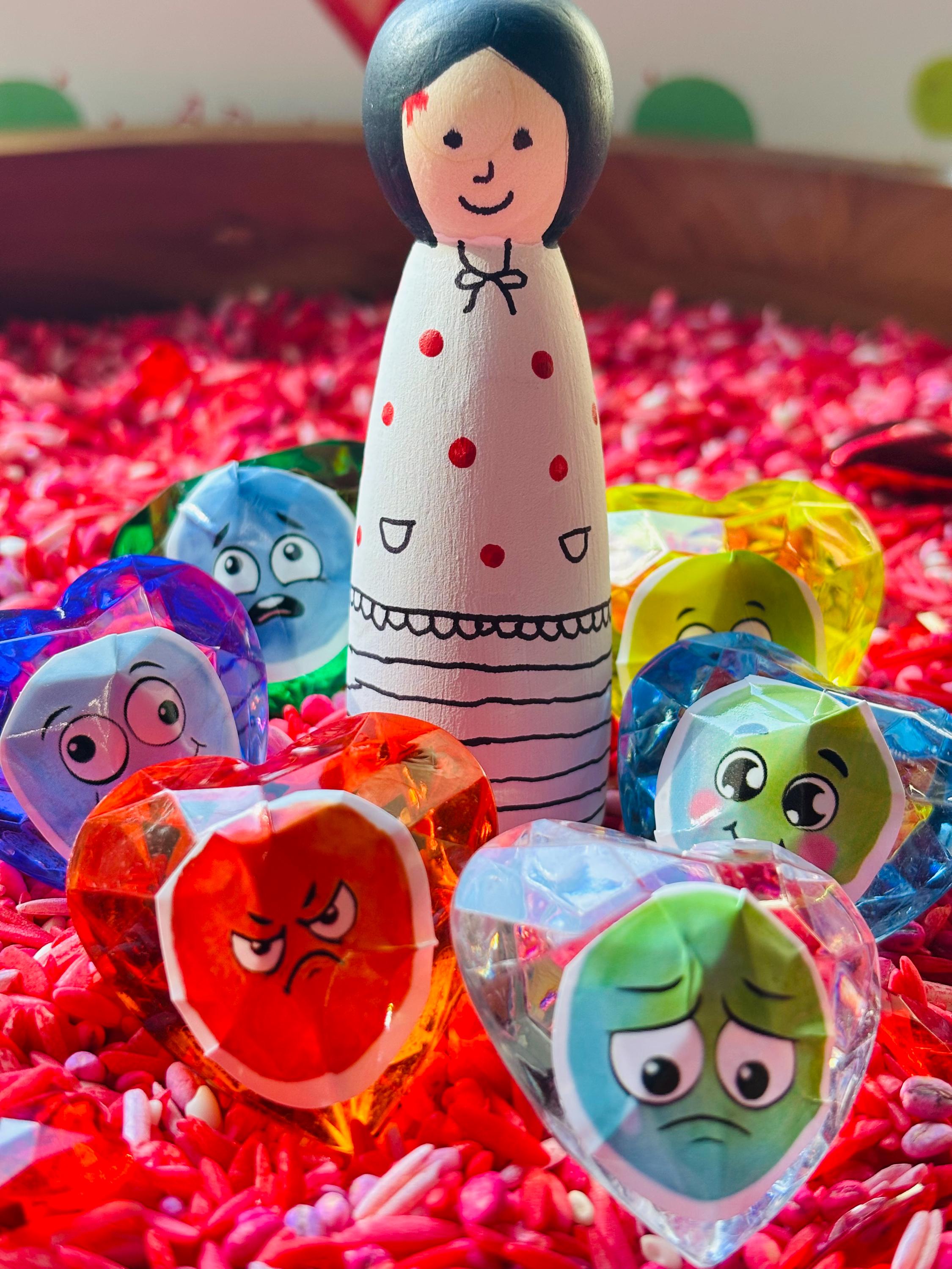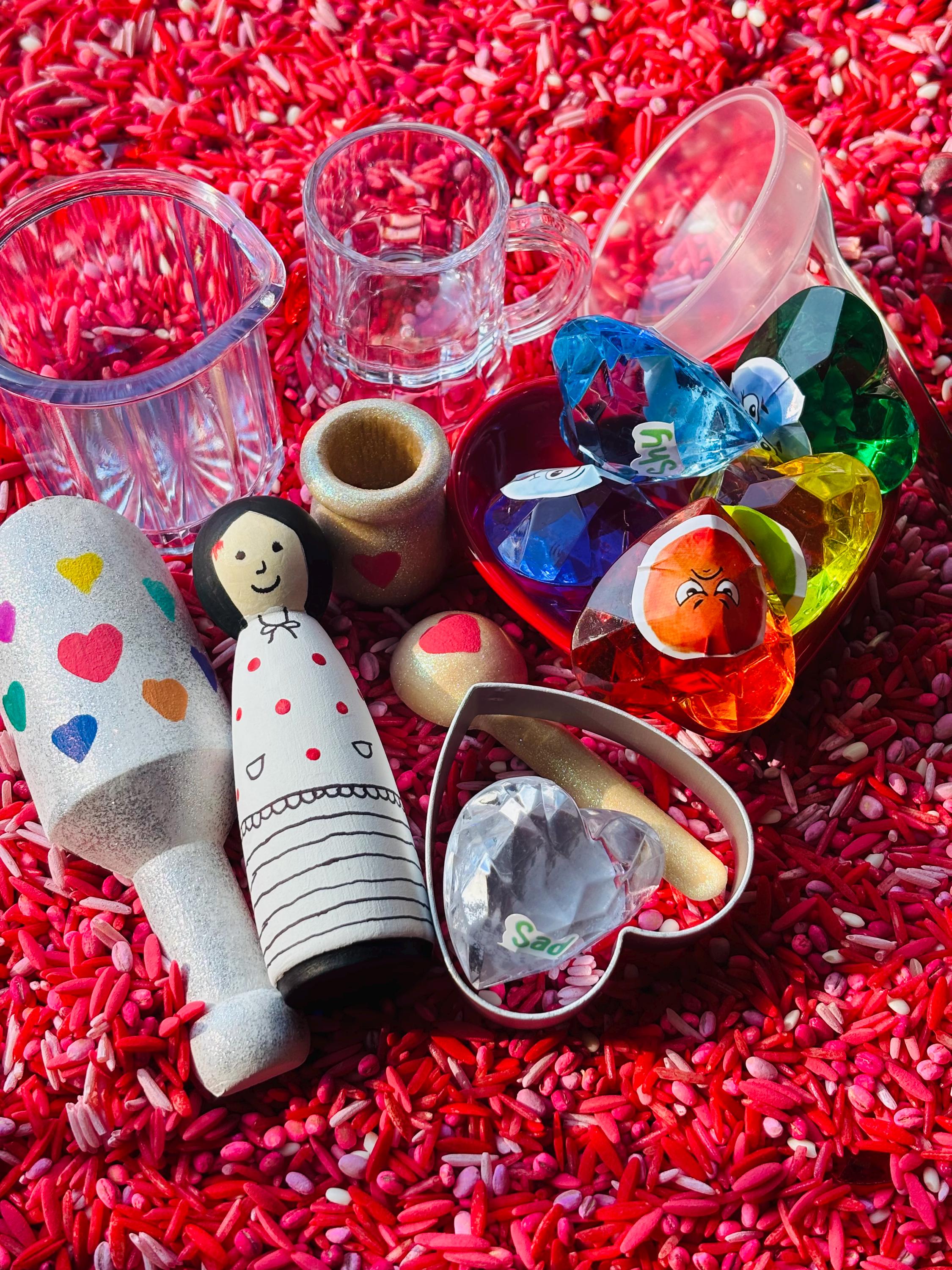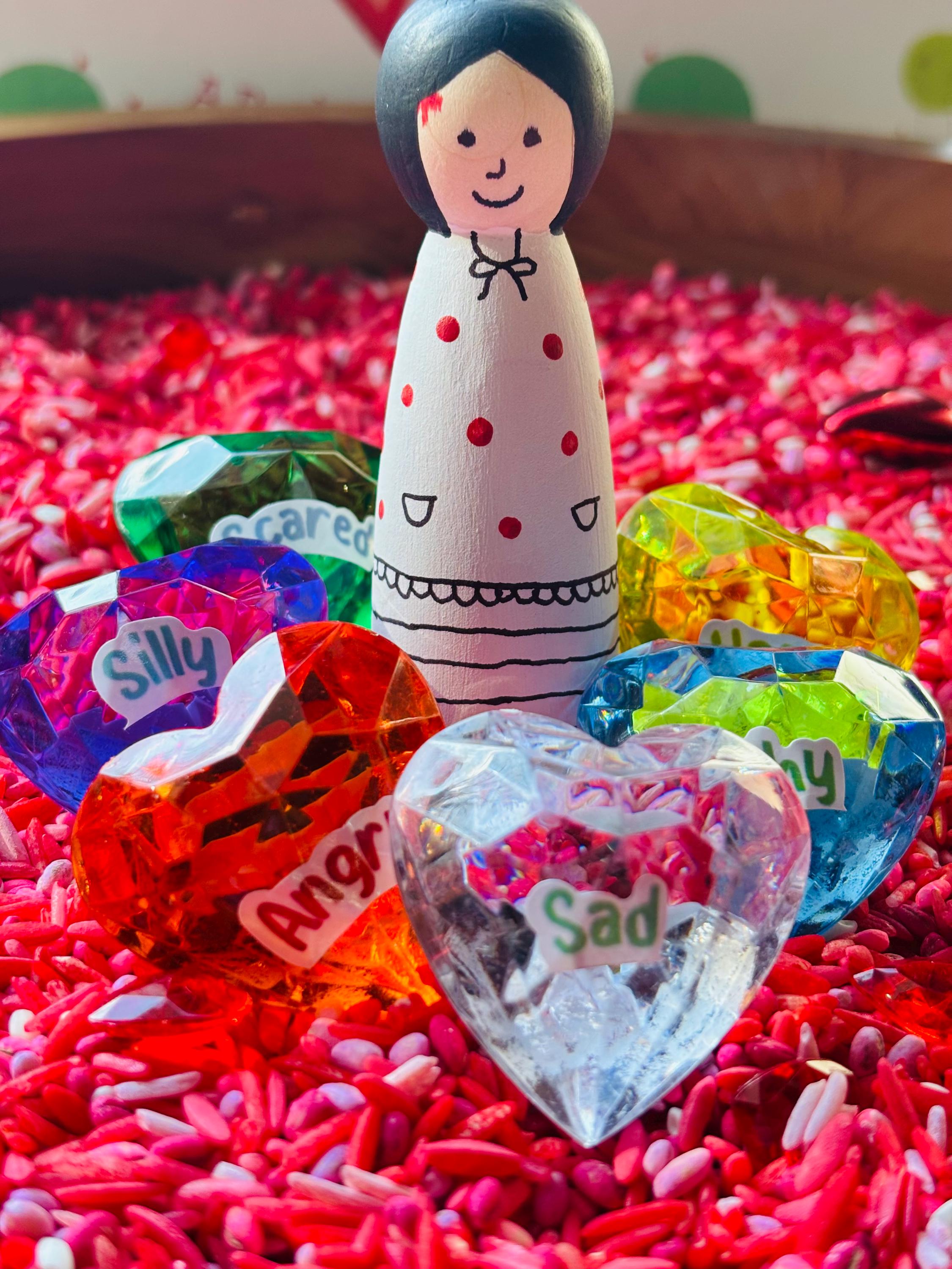 * Loose parts - a wooden hand painted girl peg doll, 6 acrylic hearts with stickers on them to depict various feelings.