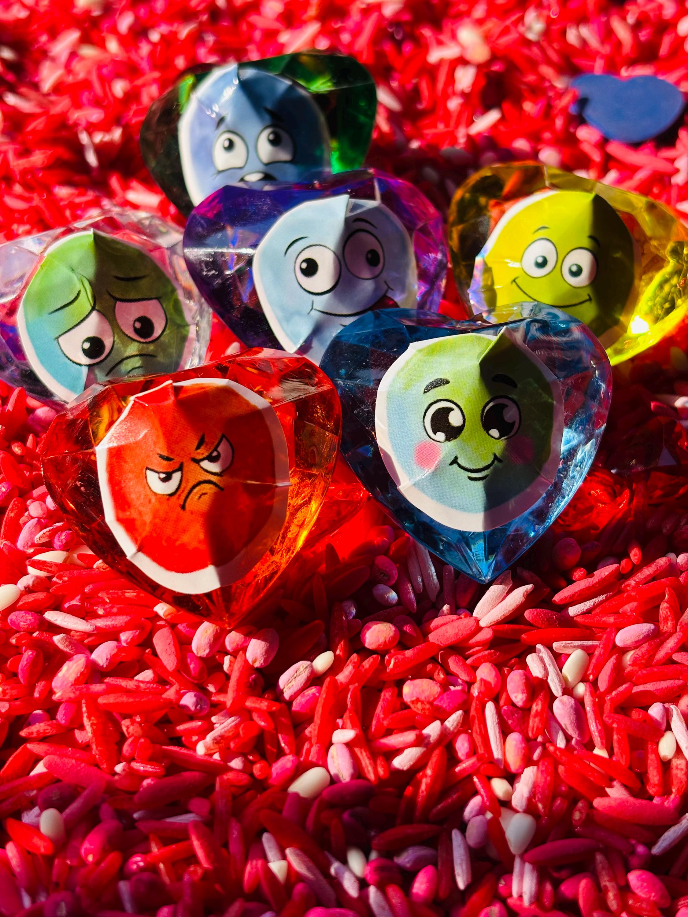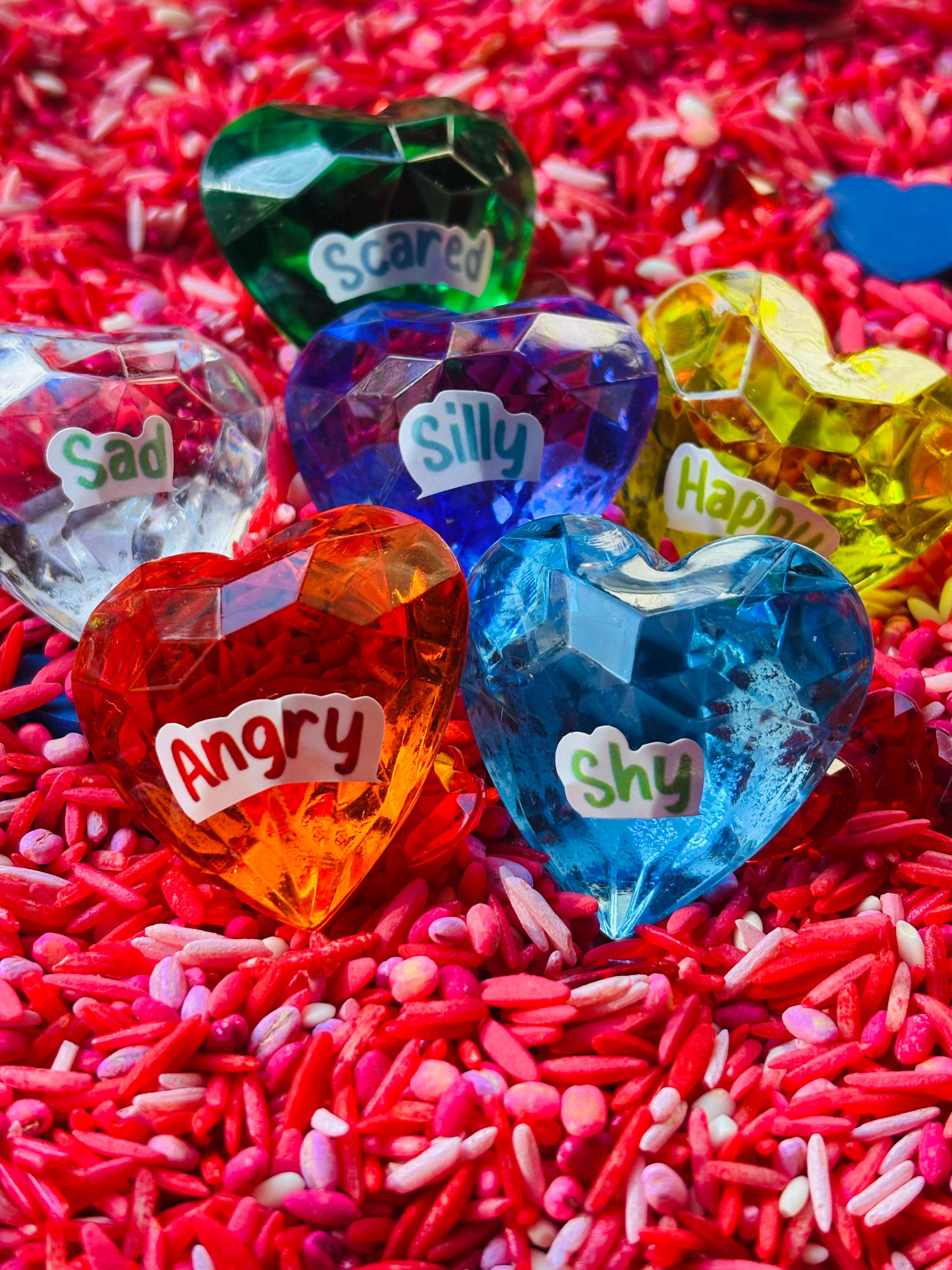 * Language Development - Encourage your child to recall and sequence details from the book. Each acrylic heart in the bin represents a different emotion helping children connect words to feelings.