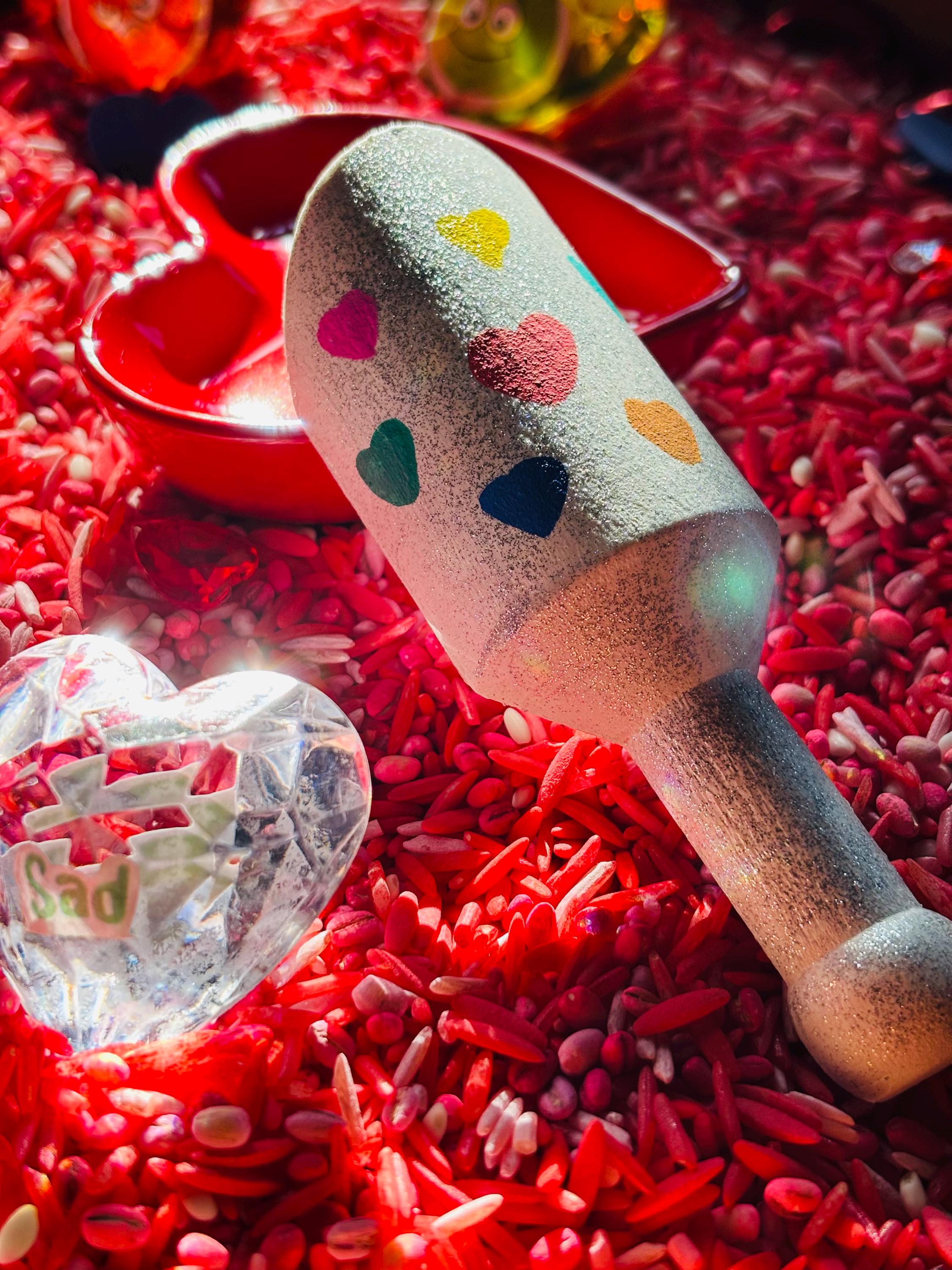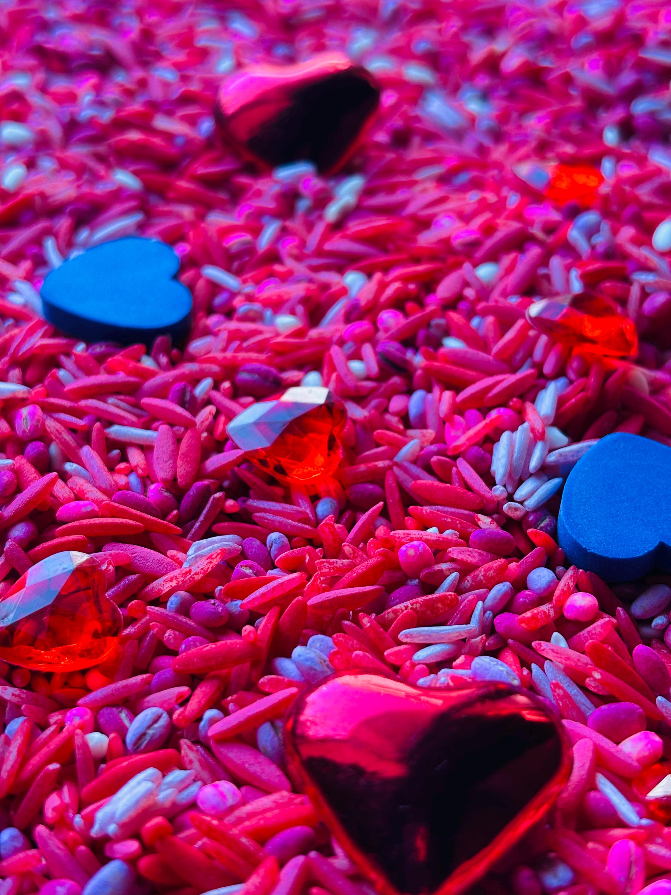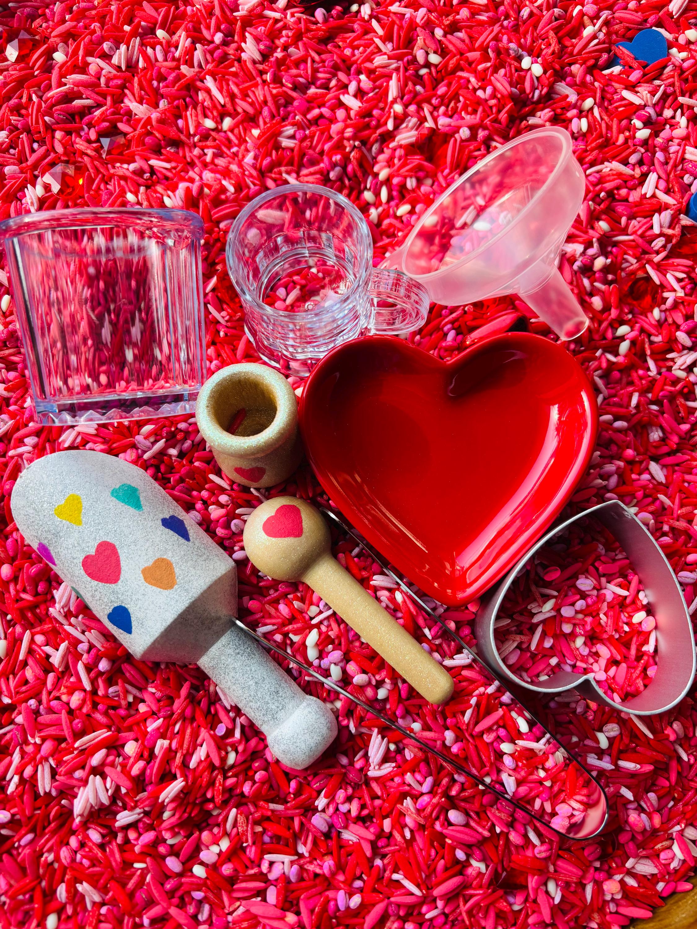 * 3 cups of sensory mix made of kid safe colored rice, barley, pasta and small acrylic hearts.