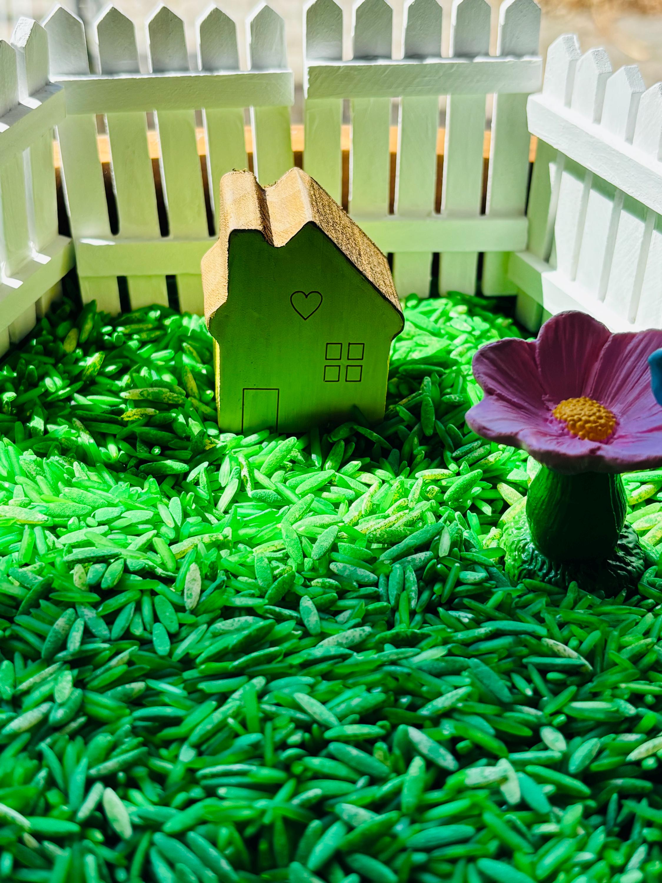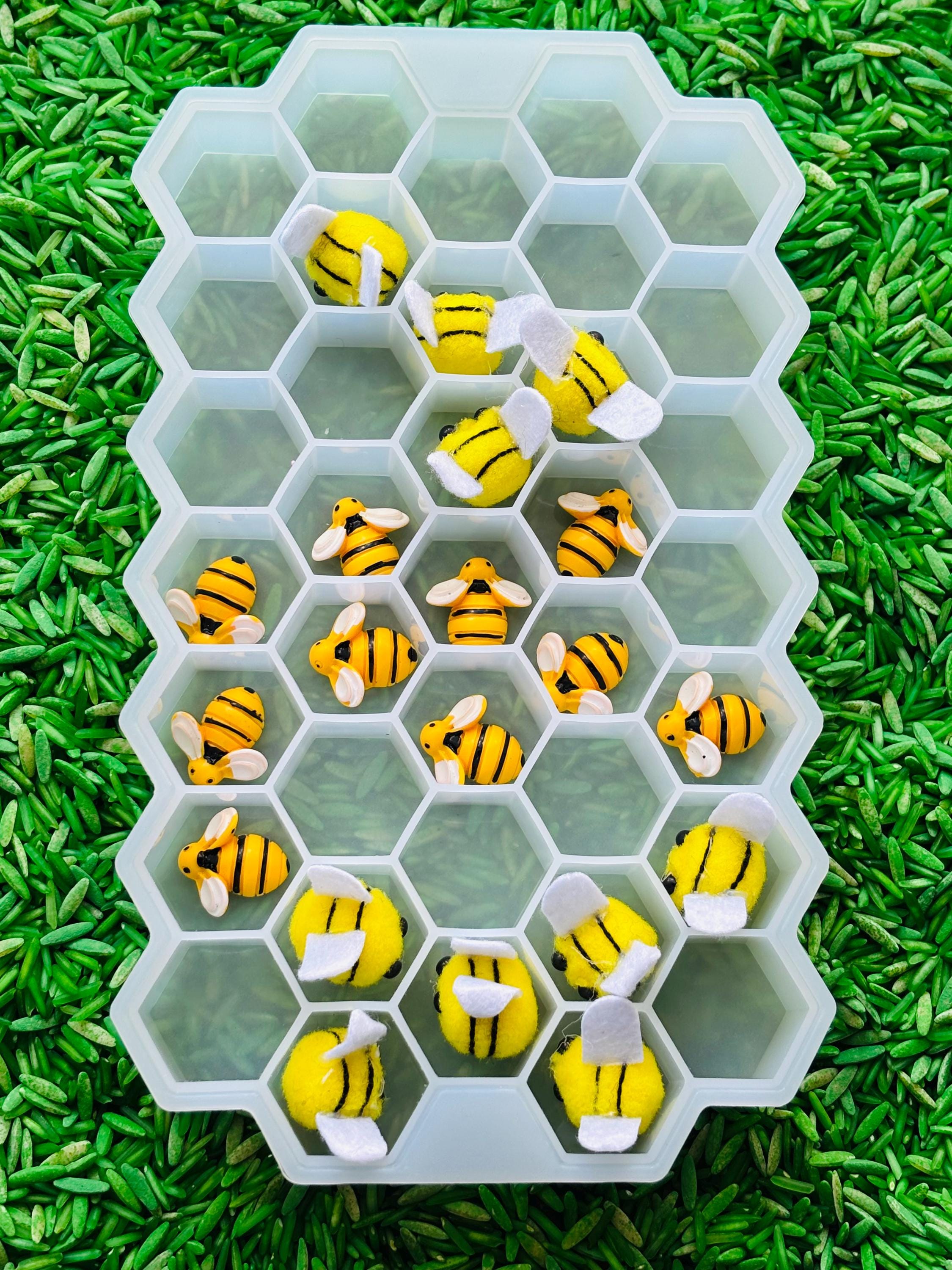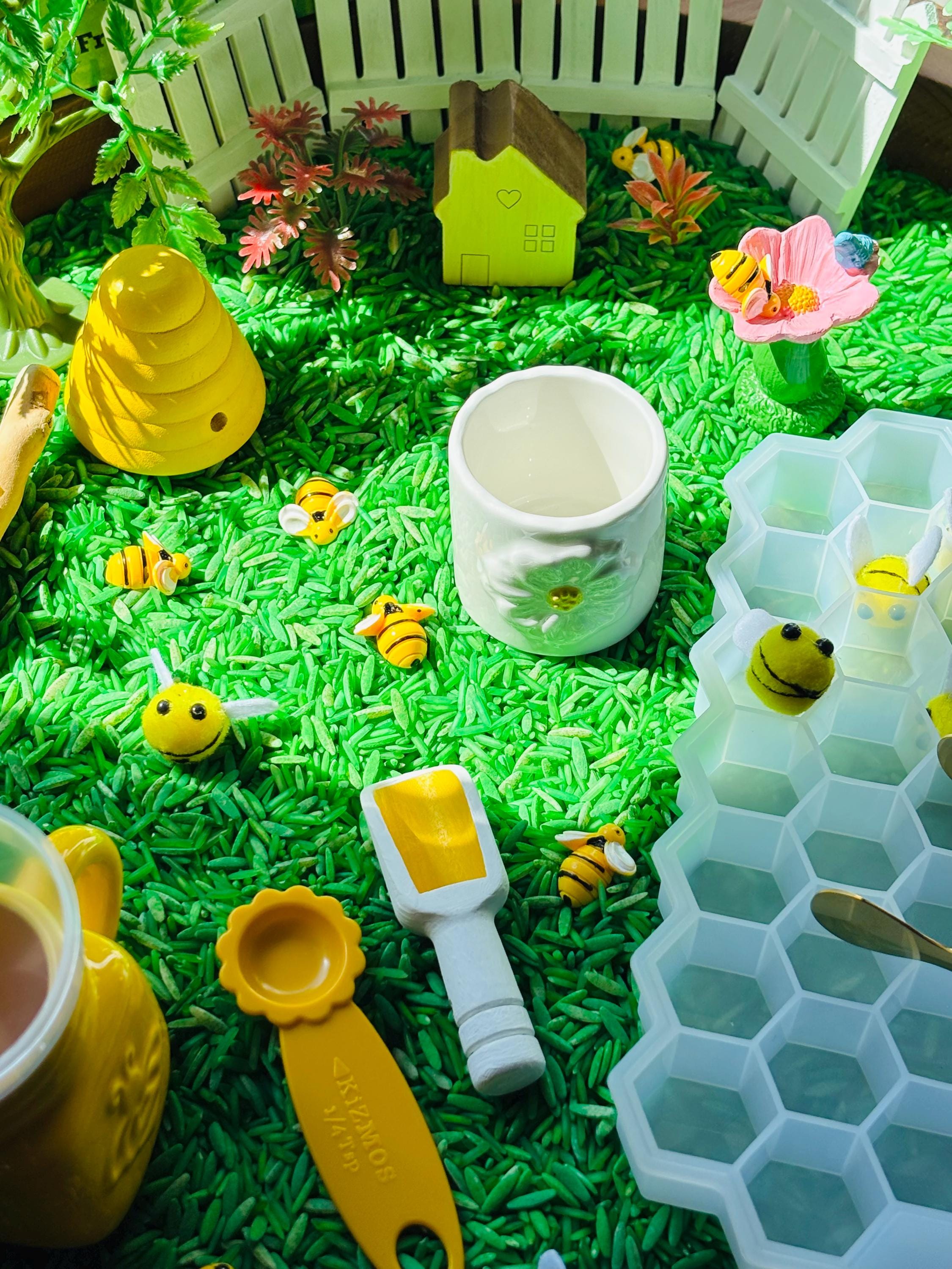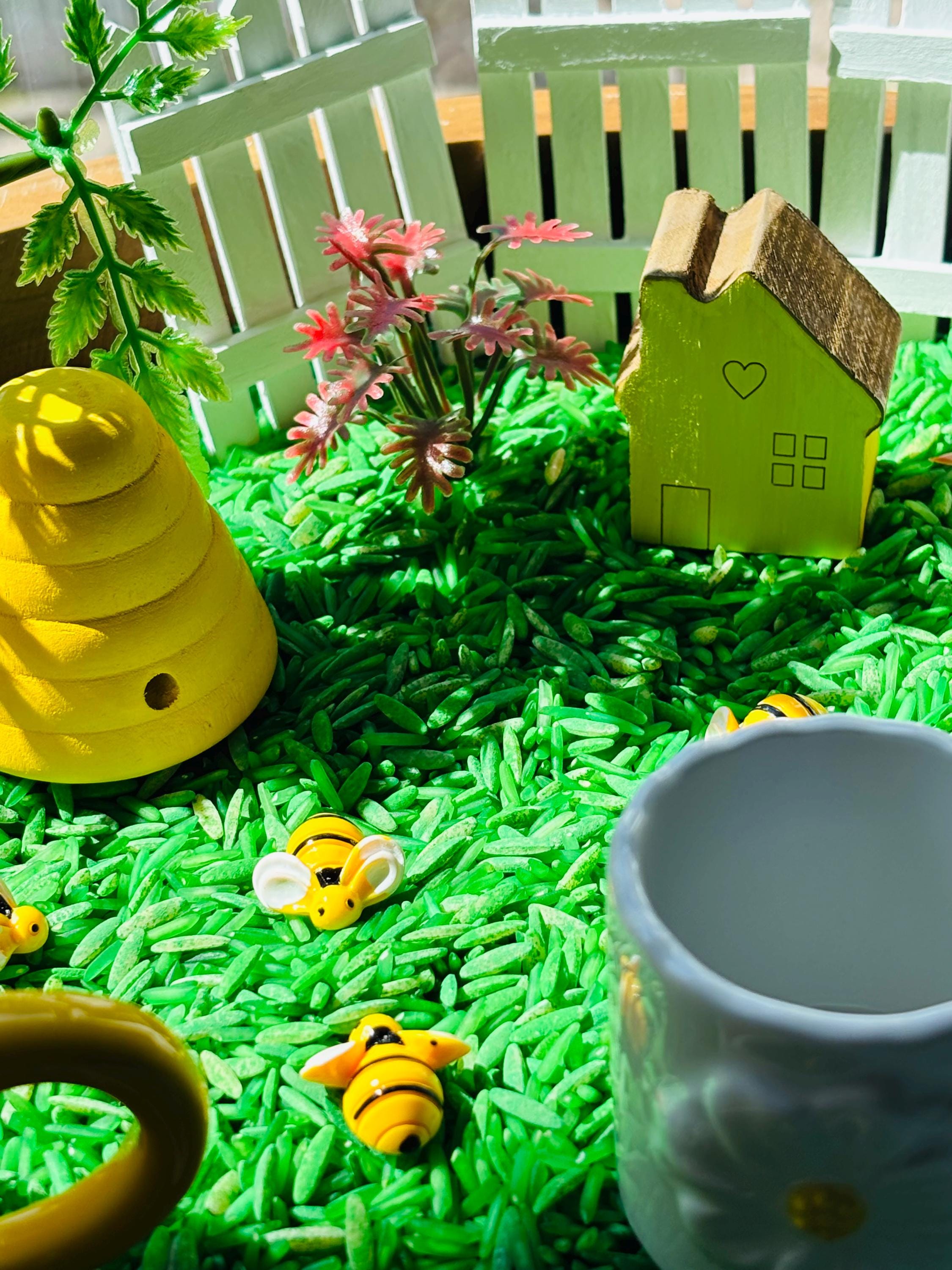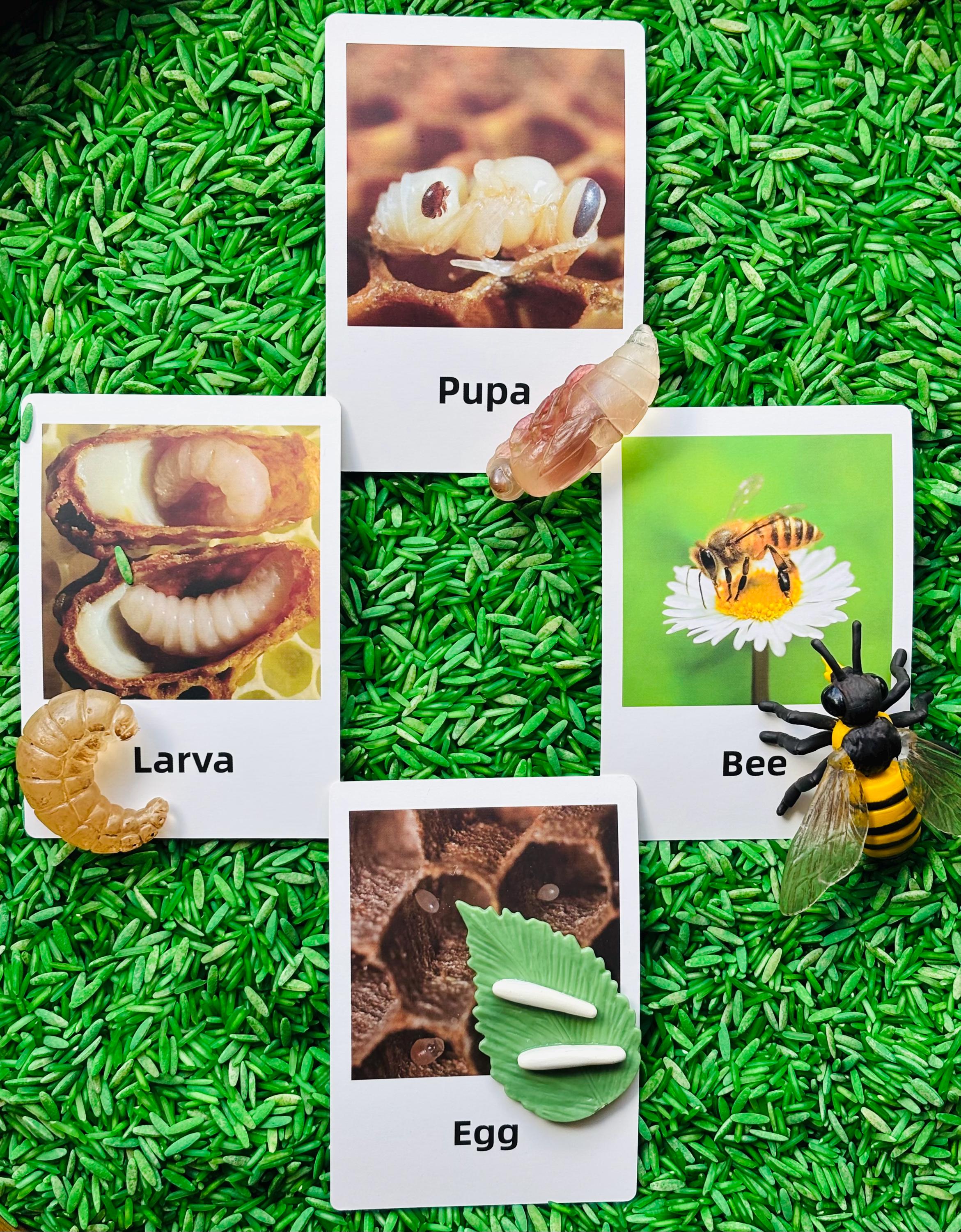 * Loose parts - white silicone hive tray, 10 small felt bees, 10 small resin bees, 2 small plastic trees, 3 small plastic shrubs, 3 small plastic flower stalks, 4 small painted wood fences, small painted wood house, small water stand for birds and bees, 5 small wooden sticks, small wood bee house, bee life cycle kit ( 4 picture life cycle cards, 1 plastic leaf with eggs, 1 plastic larva, 1 plastic pupa, 1 plastic bee).