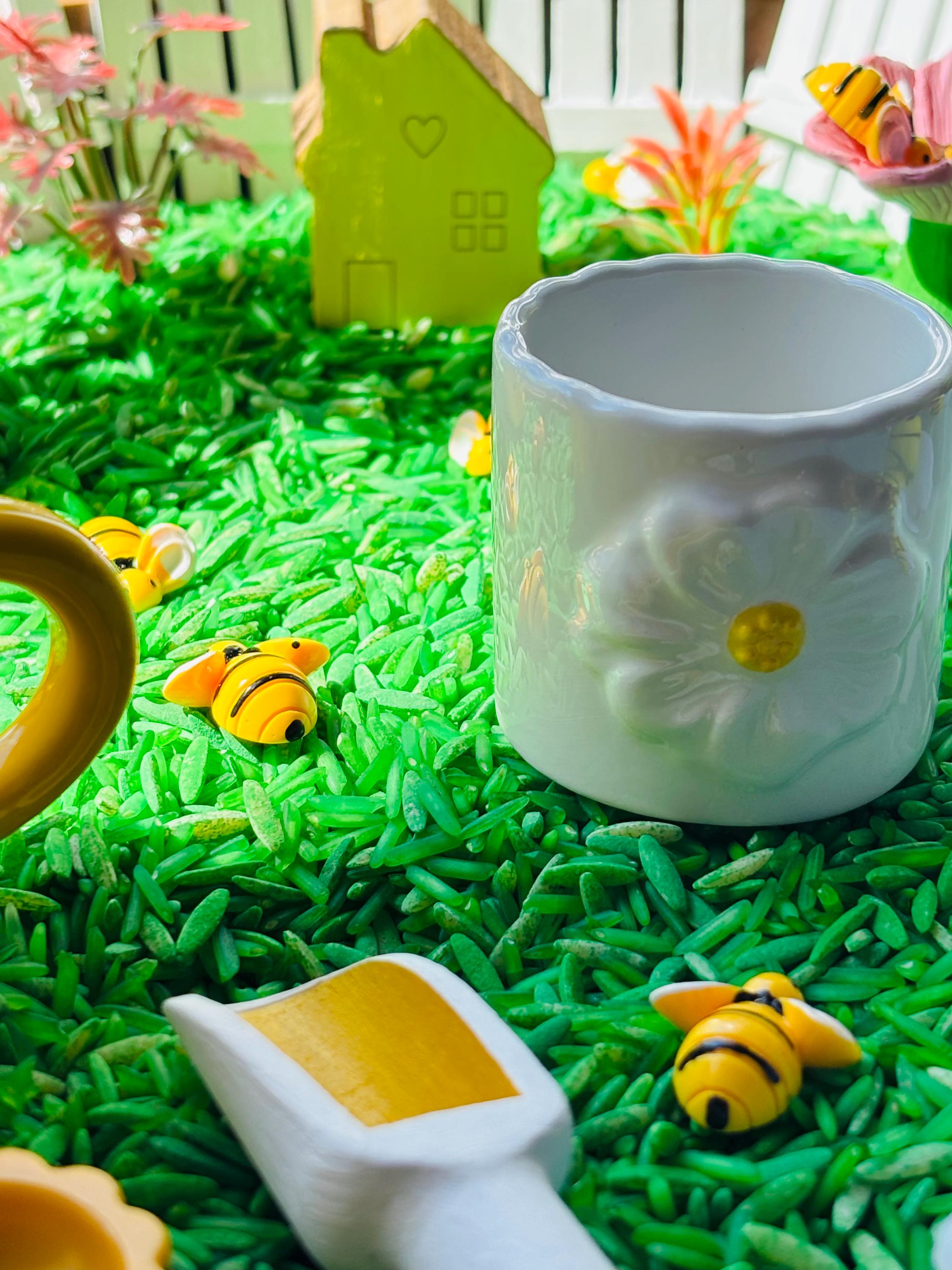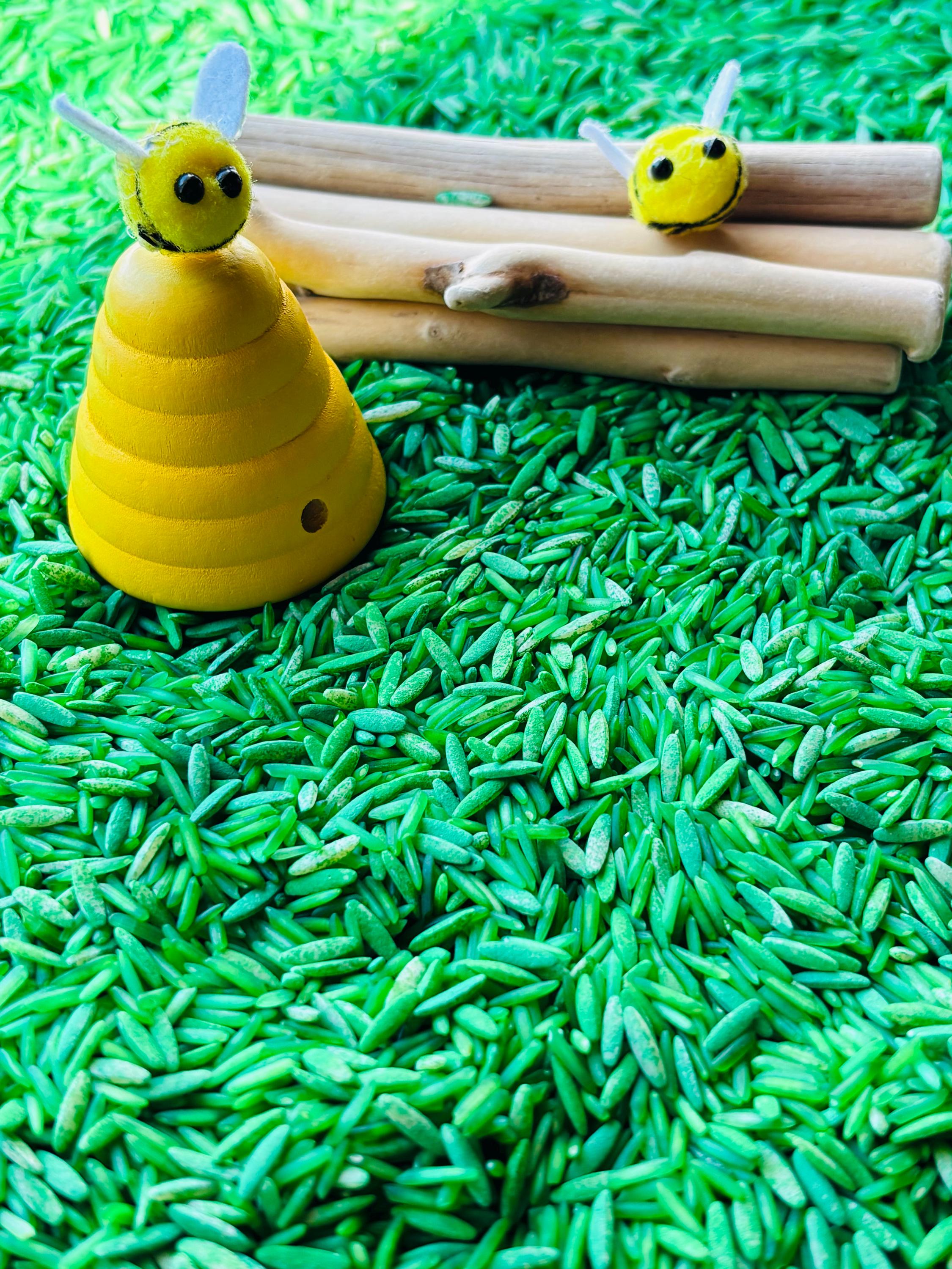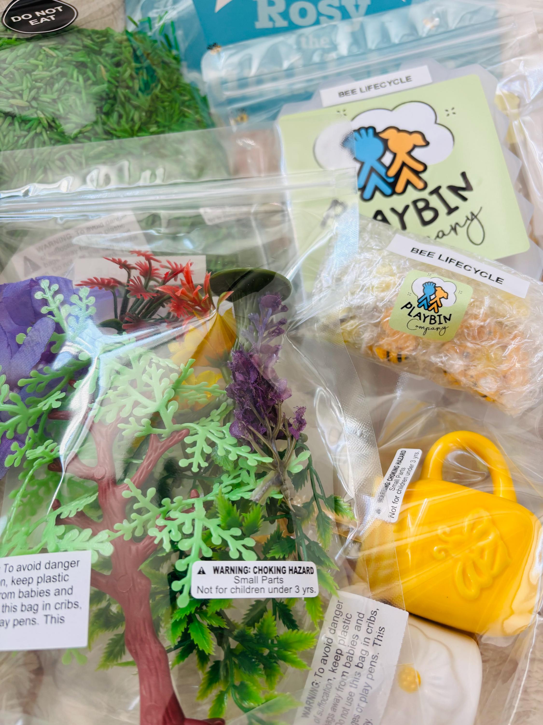 Join Rosy the bumblebee in a hands-on adventure! As children scoop, tong, and explore the bee habitat & bee life cycle in the sensory bin, they learn how bees help plants grow!