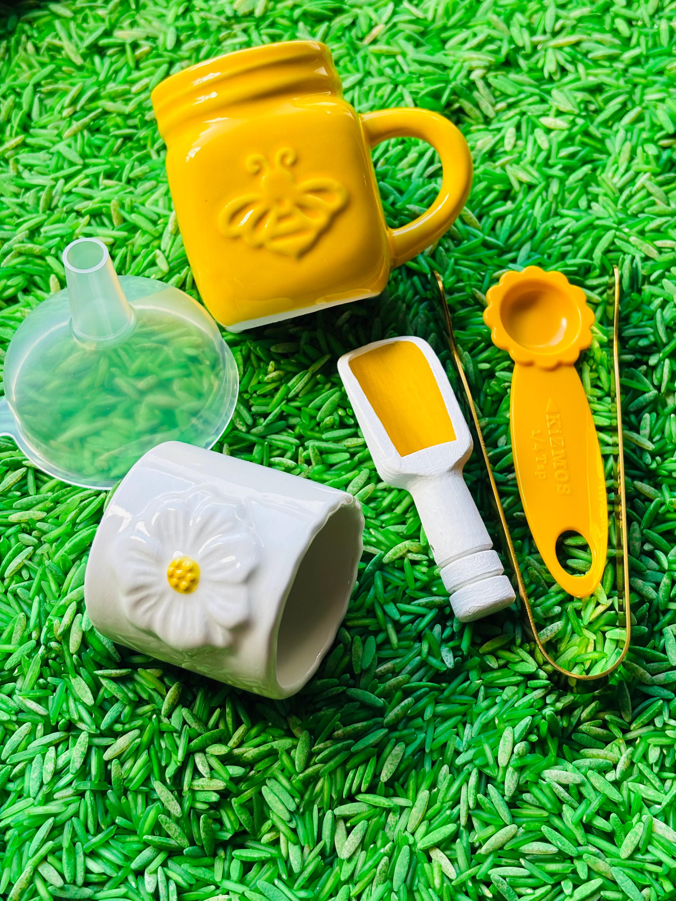* Tools such as a steel tong, plastic flower spoon, small ceramic white cup, small ceramic yellow cup with handle, small plastic funnel, and a hand painted mini wooden scoop.