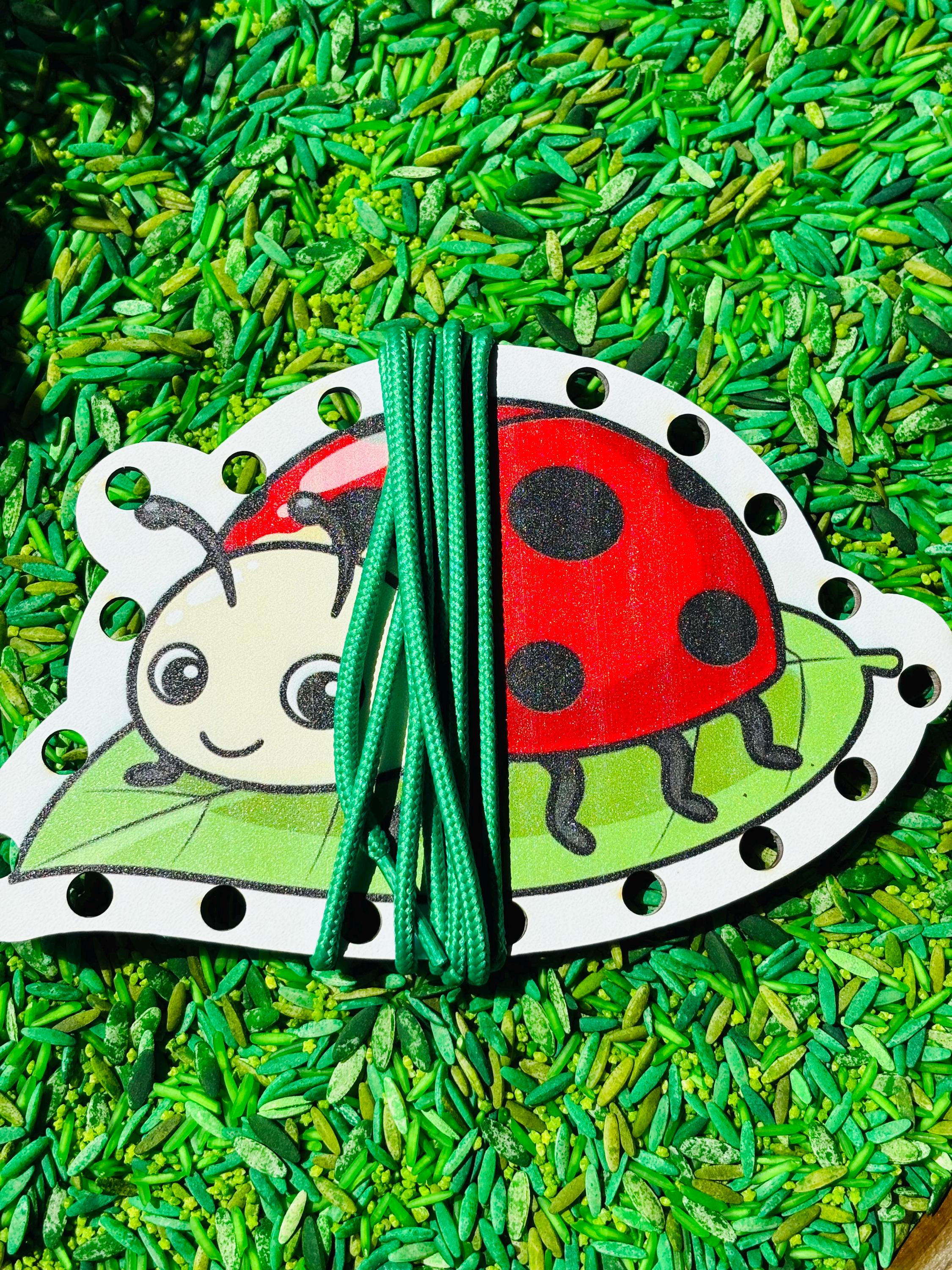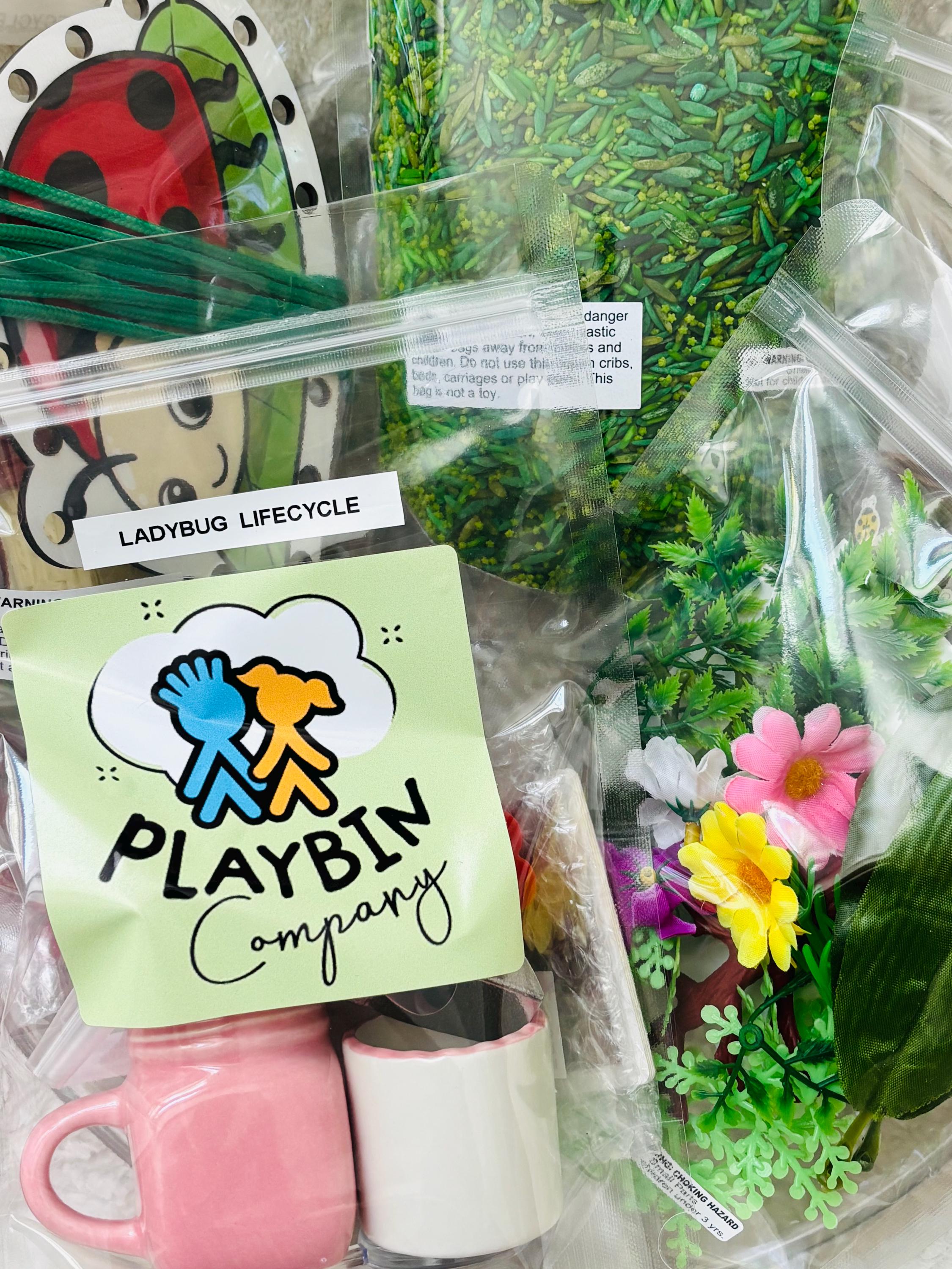 * Loose parts - 5 medium plastic ladybugs, 25 small wooden ladybugs, 3 small plastic bugs(praying mantis, grasshopper), small plastic bird(blue jay), resin house, 2 small plastic trees, 2 small plastic leaves, 5 small fabric flowers, 2 small plastic grass, wood ladybug lacing card with string, ladybug lifecycle kit(4 picture lifecycle cards, plastic leaf with eggs, plastic larva, plastic pupa, plastic ladybug).