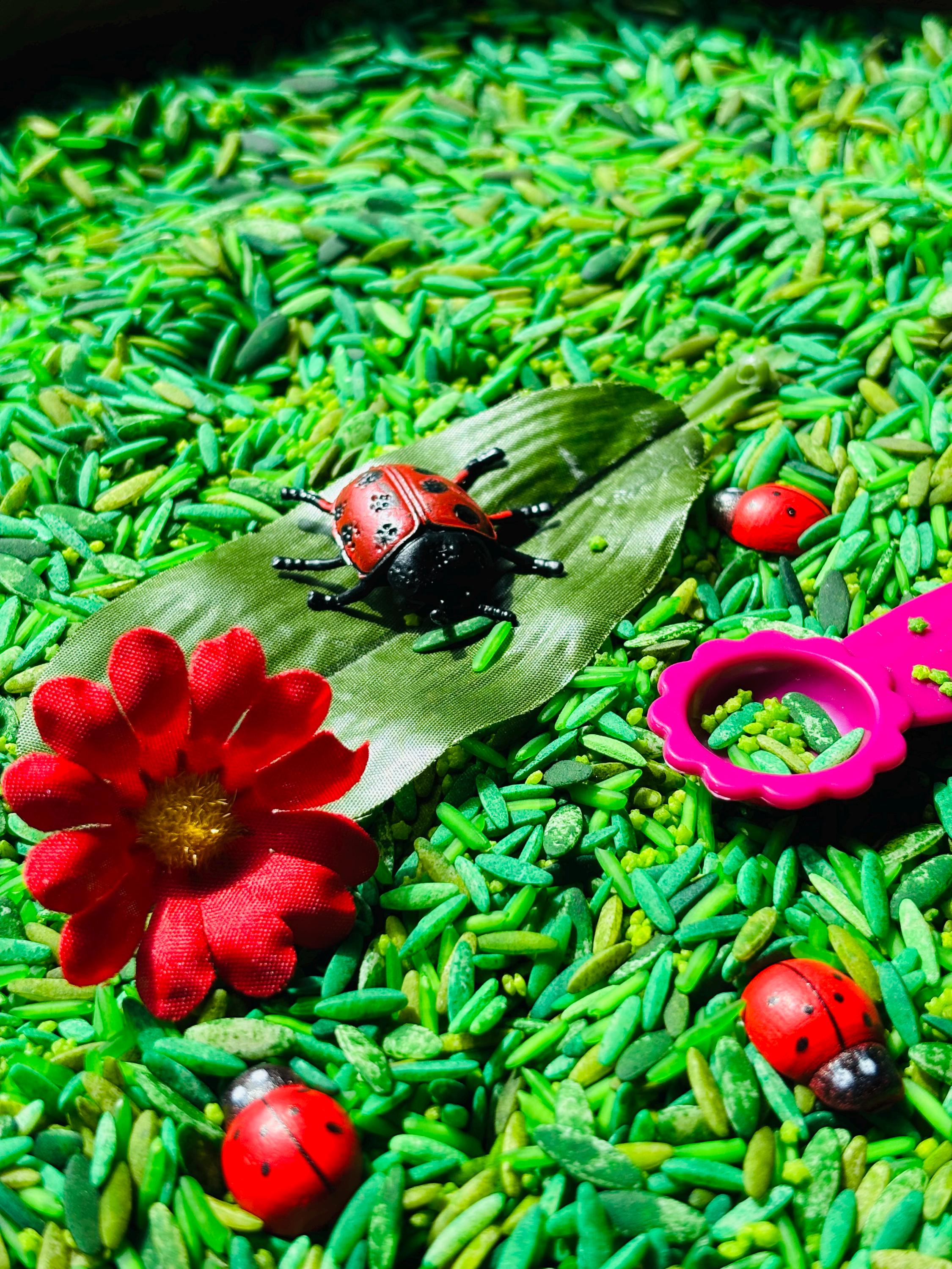 * Language Development - Encourage your child to recall details from the book and to sequence the lifecycle of the ladybug, while having meaningful conversation about nature and transformations. Vocabulary development, story connection, and expressive language emerge when children engage in book based sensory play.