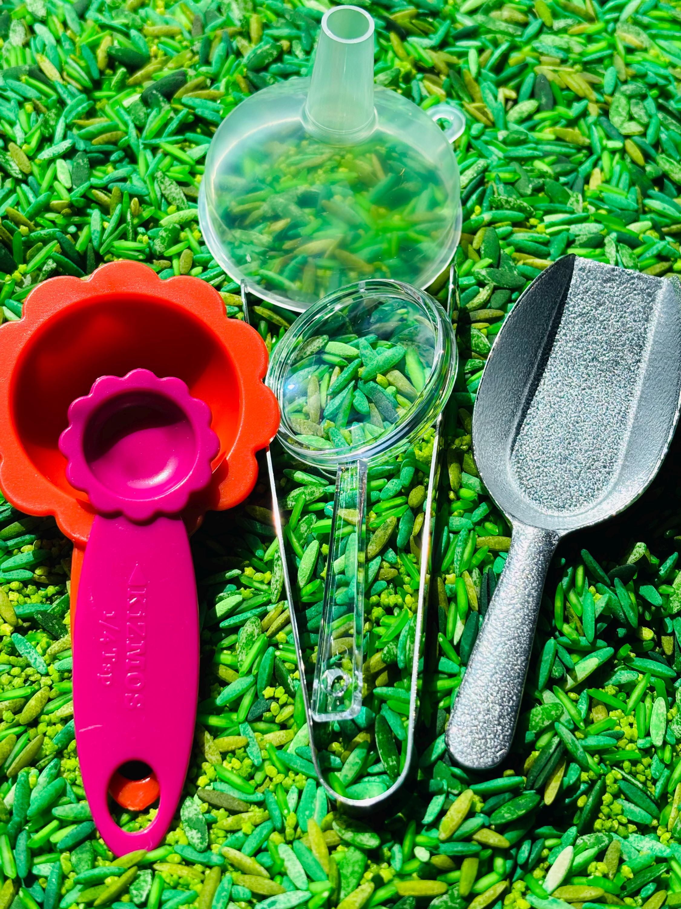 * Fine Motor Skills - Scoop, spoon, tong, and pour using the tools provided to develop pincer grip and hand strength essential for writing.