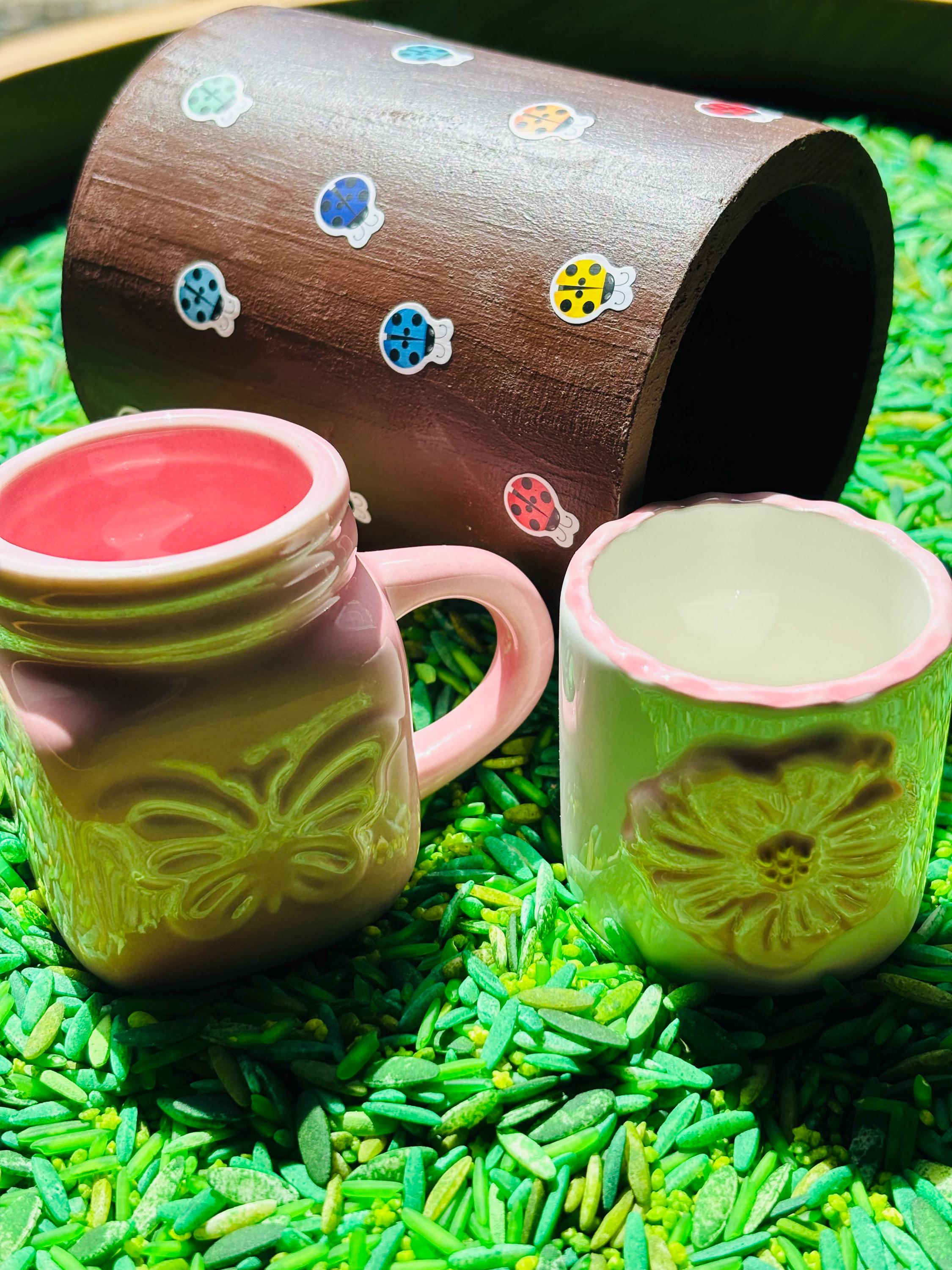 * Tools such as - a small steel tong, small metal scoop, 2 small plastic flower shaped spoons, a small plastic funnel, a small magnifier, a small ceramic jar with handle, a small ceramic cup and a painted wooden pencil cup.